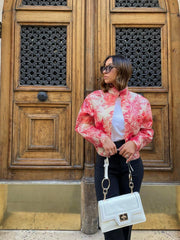 White matte PVC jacket with red floral pattern inspired by toile de Jouy, small collar, two vertical pockets, long sleeves. Black label, white graphics. Size 38.