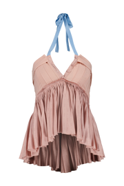 Top in nude crepe, highlighted with satin ruffles, shaped, tying with a sky blue link. White label, brown graphics. Size 40.