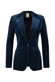 Carbon velvet jacket, notched shawl collar, single button fastening, three patch pockets, long sleeves, back slit. White label, brown graphics. Size 38.