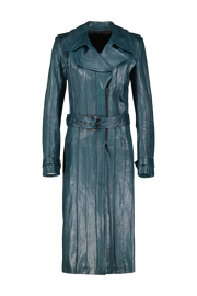 Zip-up coat in mallard calfskin with ribbed stitching, notched shawl collar, shoulder tabs, cuff tabs on long sleeves, belt. Black label, white graphics.
