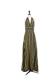 Long evening dress in black crepe embroidered with an empire-inspired pattern in gold lurex, old gold, American neckline, chest highlighted with an inlaid belt. Beige claw, black graphics. T.38.