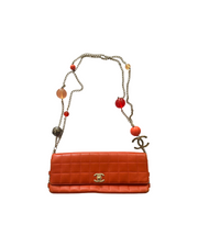 Circa 2002 26cm "East West" bag in orange lambskin with Choco bar stitching, gold-toned metal "CC" clasp on flap, double chain handle embellished with colored resin beads, some in signed metal.